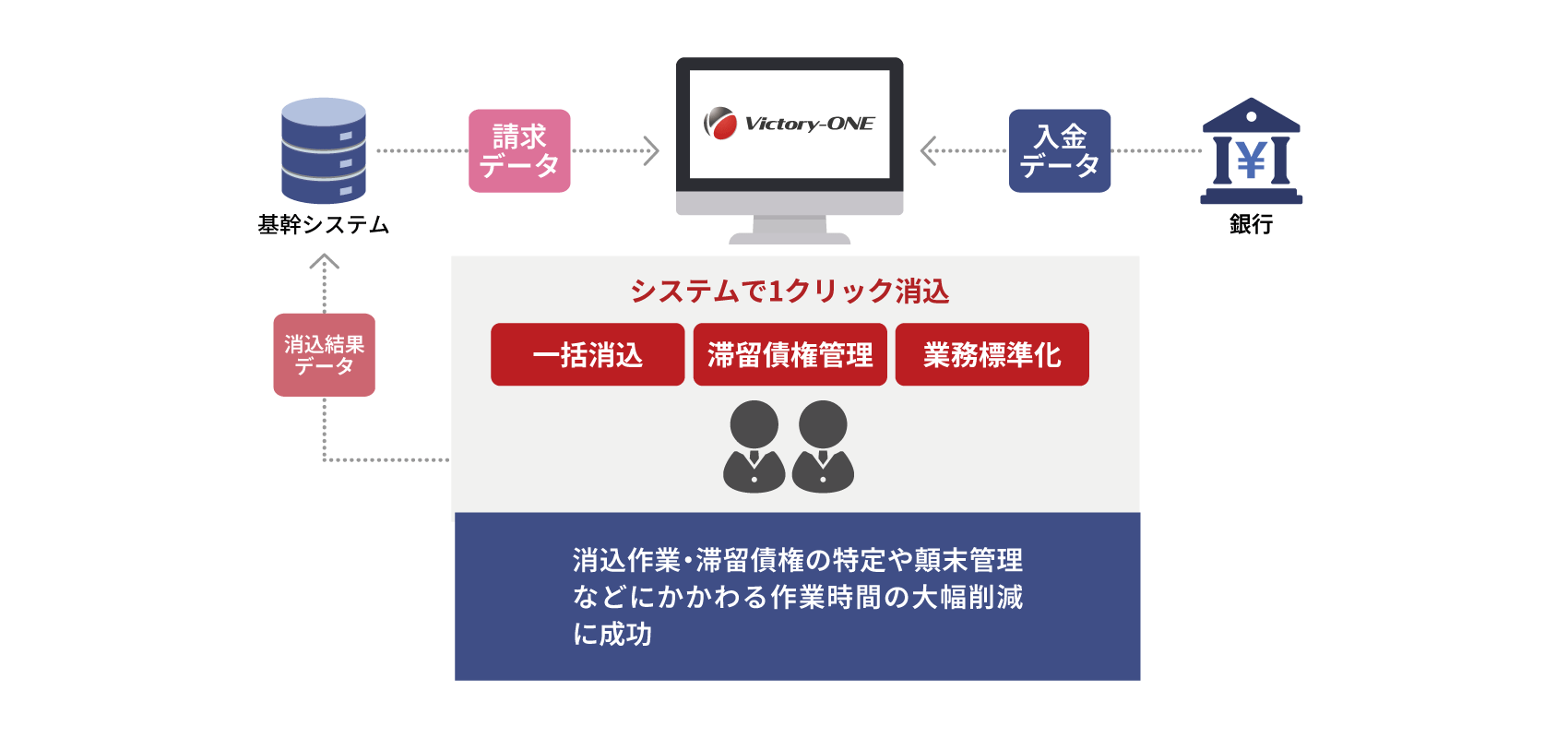 「Victory-ONE G4」の導入は、債権の可視化と属人化の解消にも役立ちました。まず、今までは経理部門の担当者個人でしか管理できなかった、顛末管理が可視化できました。そして未入金も一覧で確認して、誰でも消込ができるようになったのです。