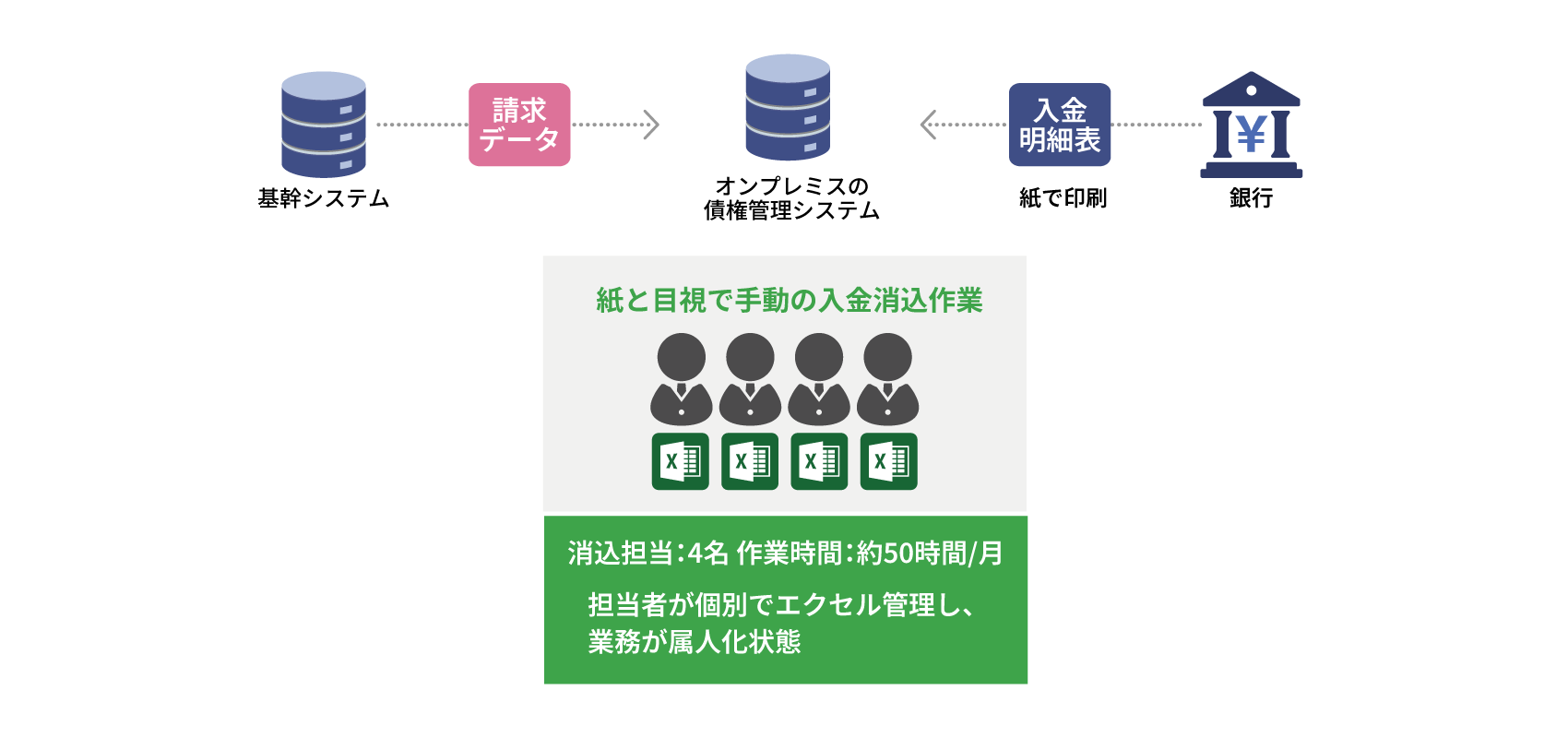 「旧来の財務会計システムは、スクラッチで作られたオンプレミスのシステムでした。開発に使われた言語も古く、これを改修するために予算はかけられなかった。消込機能もありましたが、取引先毎にコード入力の必要があり、手間もかかりました。また、消込残管理も一括金額での管理となるため、顛末管理ができませんでした。」(櫻井氏)
