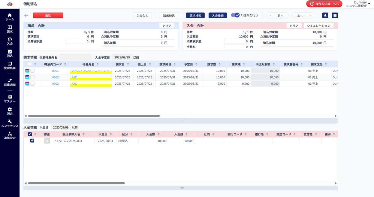 「一括消込」で不一致となった入金に対し、AIが請求候補を提案