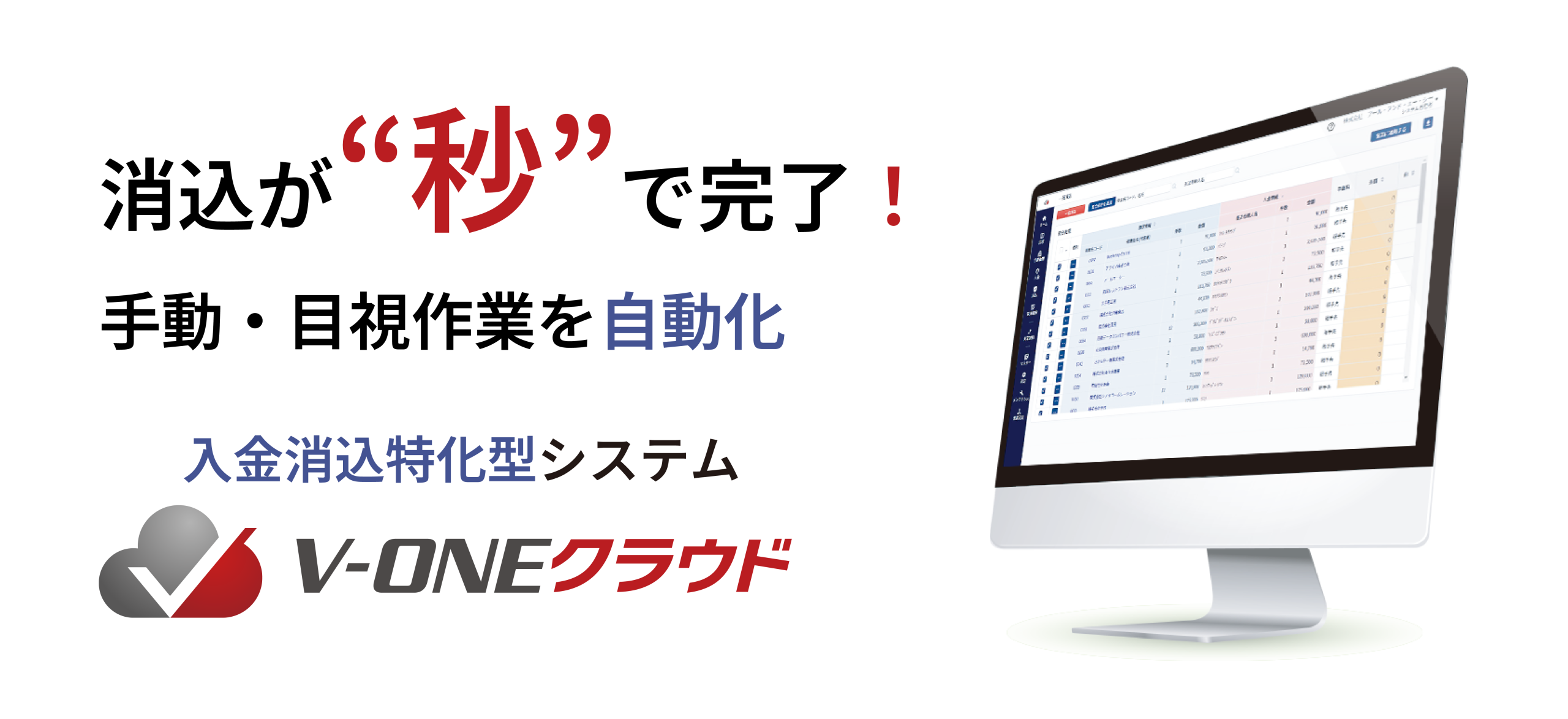 債権管理の中でも入金方法や消費税、手数料等で煩雑になりやすい入金消込業務は、目視や手入力、表計算ソフト等を利用したアナログな作業が中心です。そのため、転記作業時の二重入力や手入力によるミス・転記漏れなどが発生しやすい業務です。また、入金消込作業には、入金日から締日の短い時間で正確に作業することが求められます。「V-ONEクラウド」は、入金消込業務に特化したクラウドサービスです。AI(機械学習)を活用し、目視・手入力になりがちな入金消込作業を大幅に効率化します。入金・回収業務の効率化による作業負荷の軽減に加え、債権管理の正確性向上、滞留債権の早期把握、迅速な回収促進などを実現します。